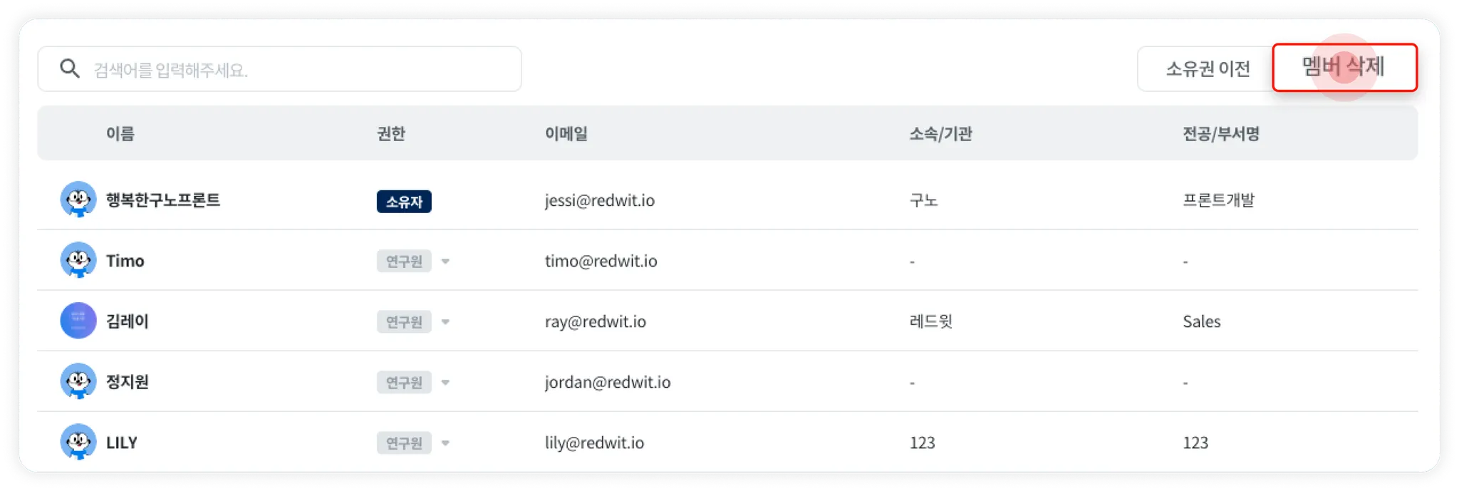 멤버 관리 테이블에서 우측 상단에 위치한 멤버 삭제 버튼을 클릭하면 멤버 삭제 모드가 활성화됩니다.