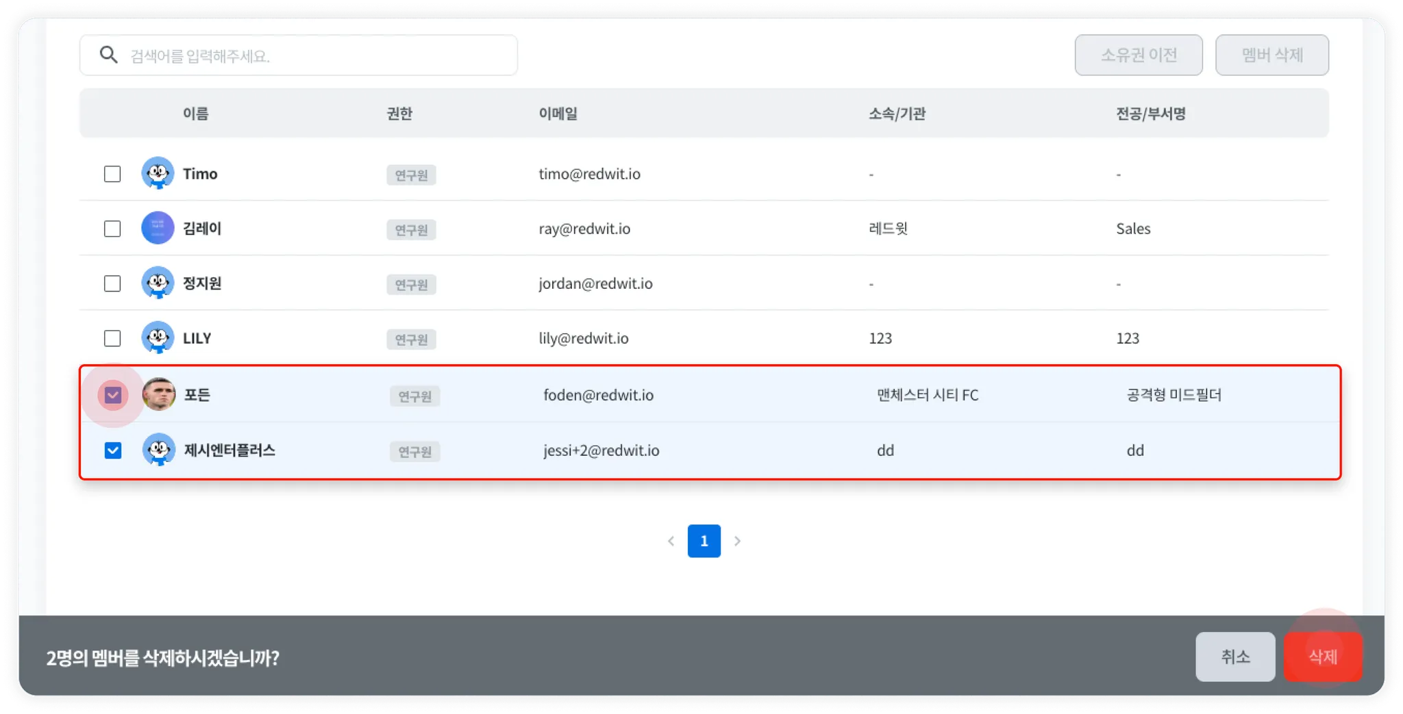 소유자 본인을 제외한 관리자와 연구원 권한의 멤버를 선택하여 삭제할 수 있습니다.