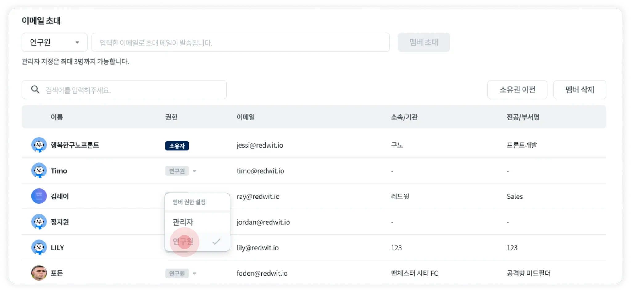 소유자는 소유권 이전 후 연구원으로 변경 후 권한 변경이 가능합니다.