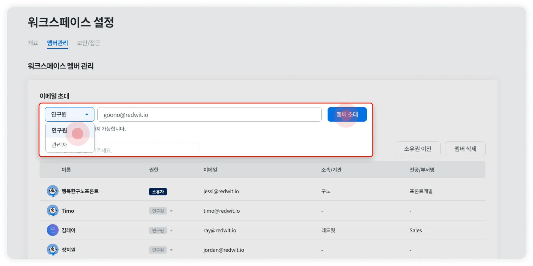 초대할 멤버의 권한을 연구원과 관리자 중 선택하고 초대할 멤버의 이메일을 입력란에 입력해주세요.