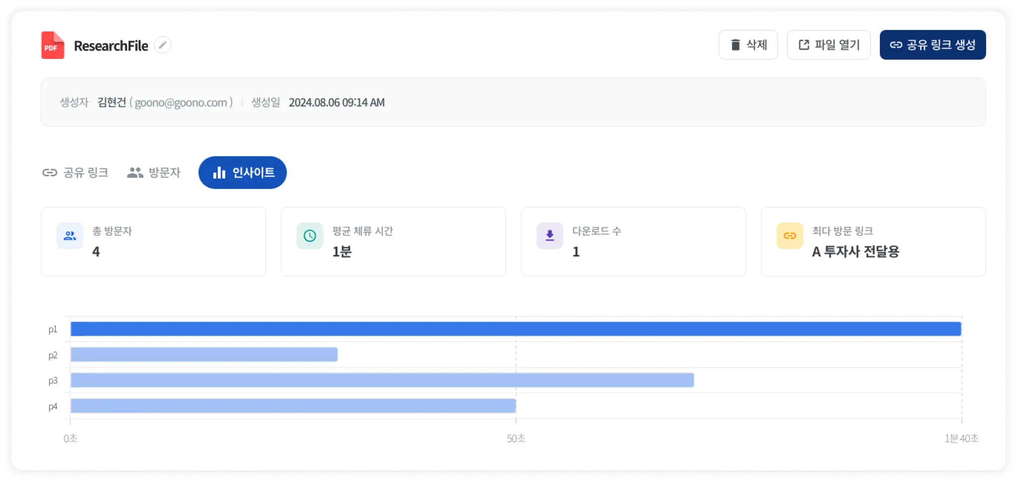 공유 링크의 방문자 이름, 이메일, 방문 횟수, 다운로드 횟수, 체류 시간을 분석 할 수 있습니다.