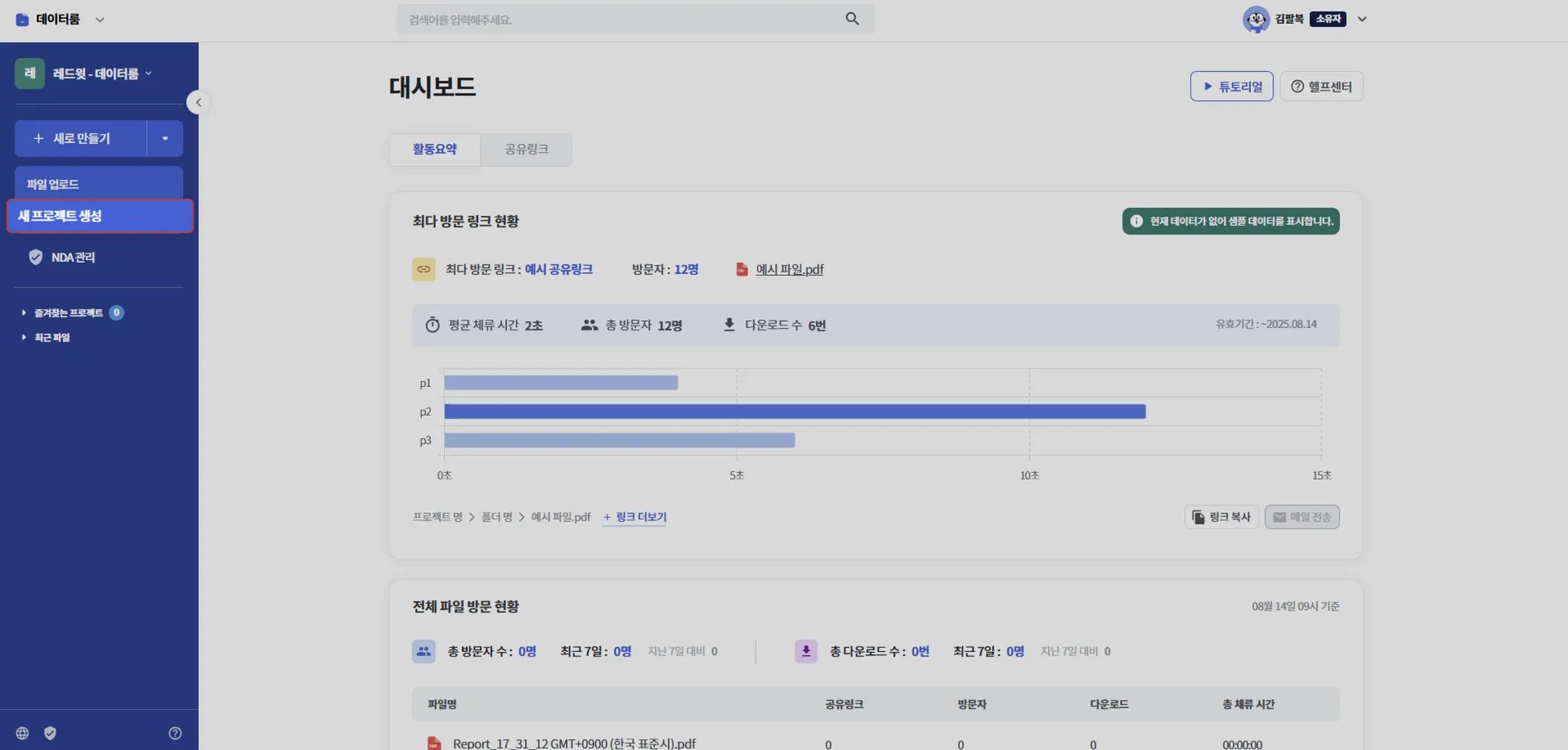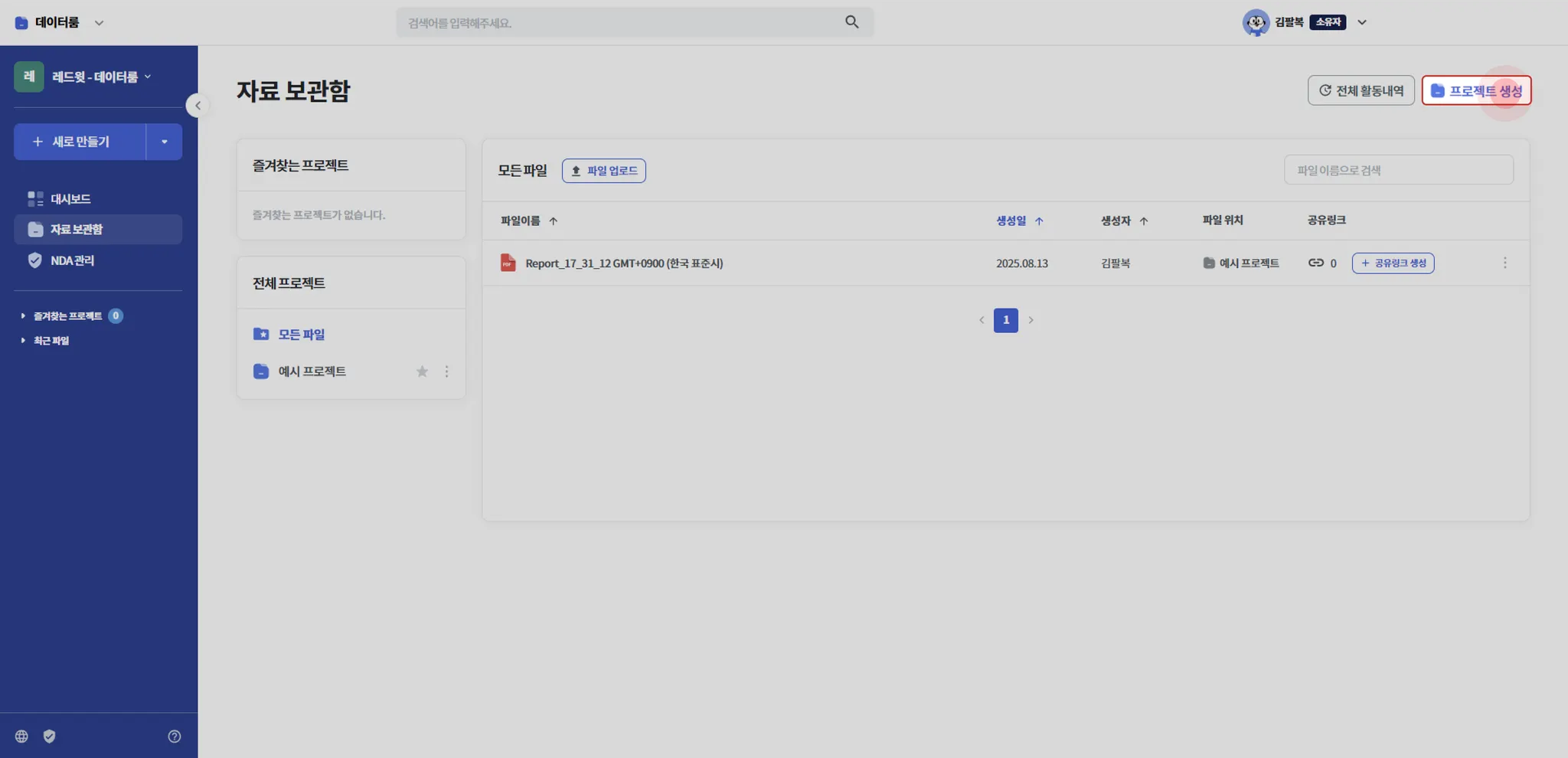 [ 자료 보관함 ] 메뉴 에서 페이지 상단의 프로젝트 생성 버튼을 클릭하여 언제든지 새로운 프로젝트를 추가할 수 있습니다.