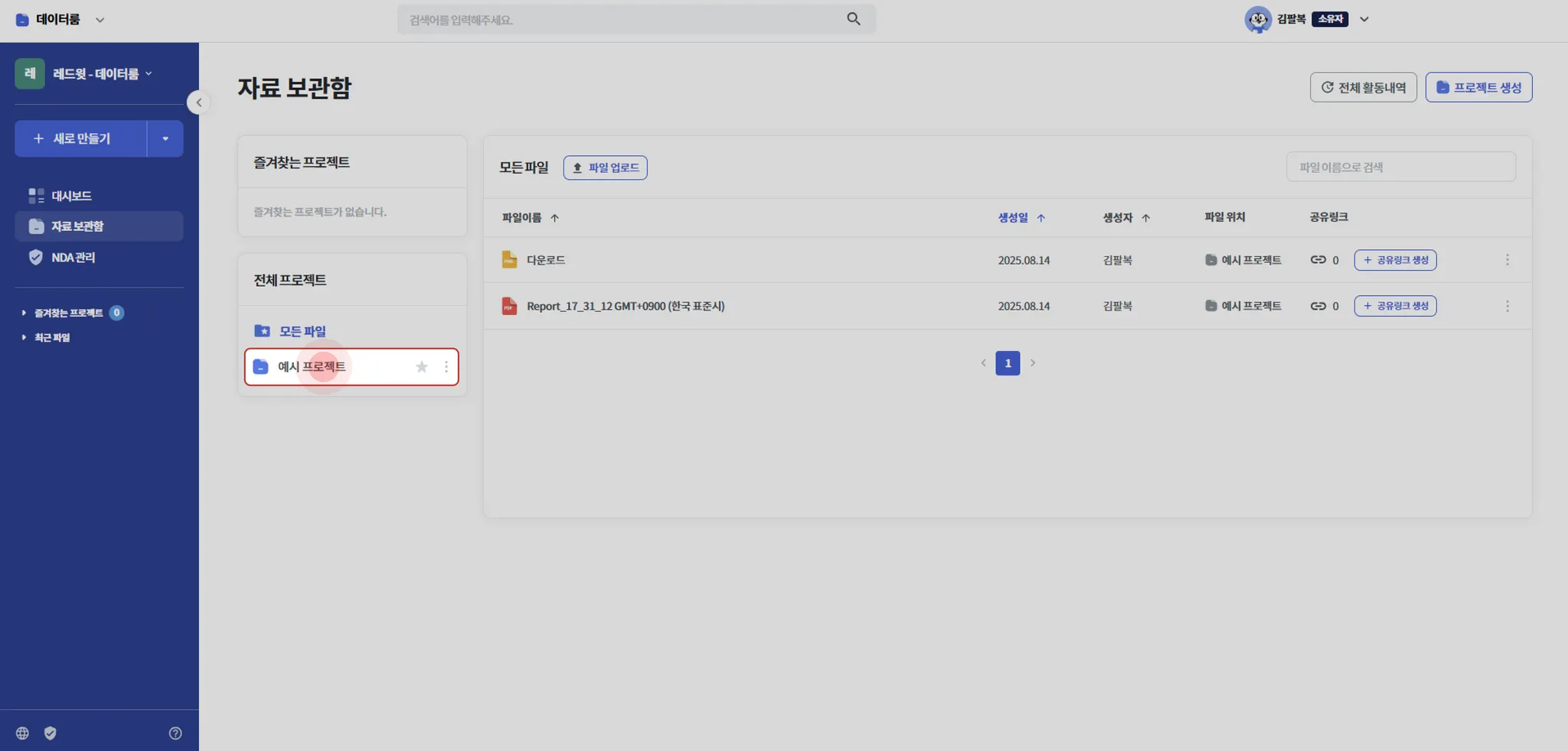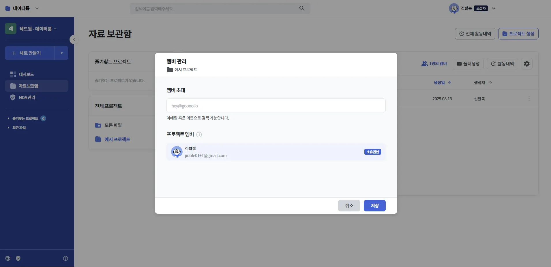 프로젝트에 멤버를 초대하기 위해서는 좌측 메뉴에서 자료 보관함 을 클릭하여 진입해 원하는 프로젝트를 선택해주세요.