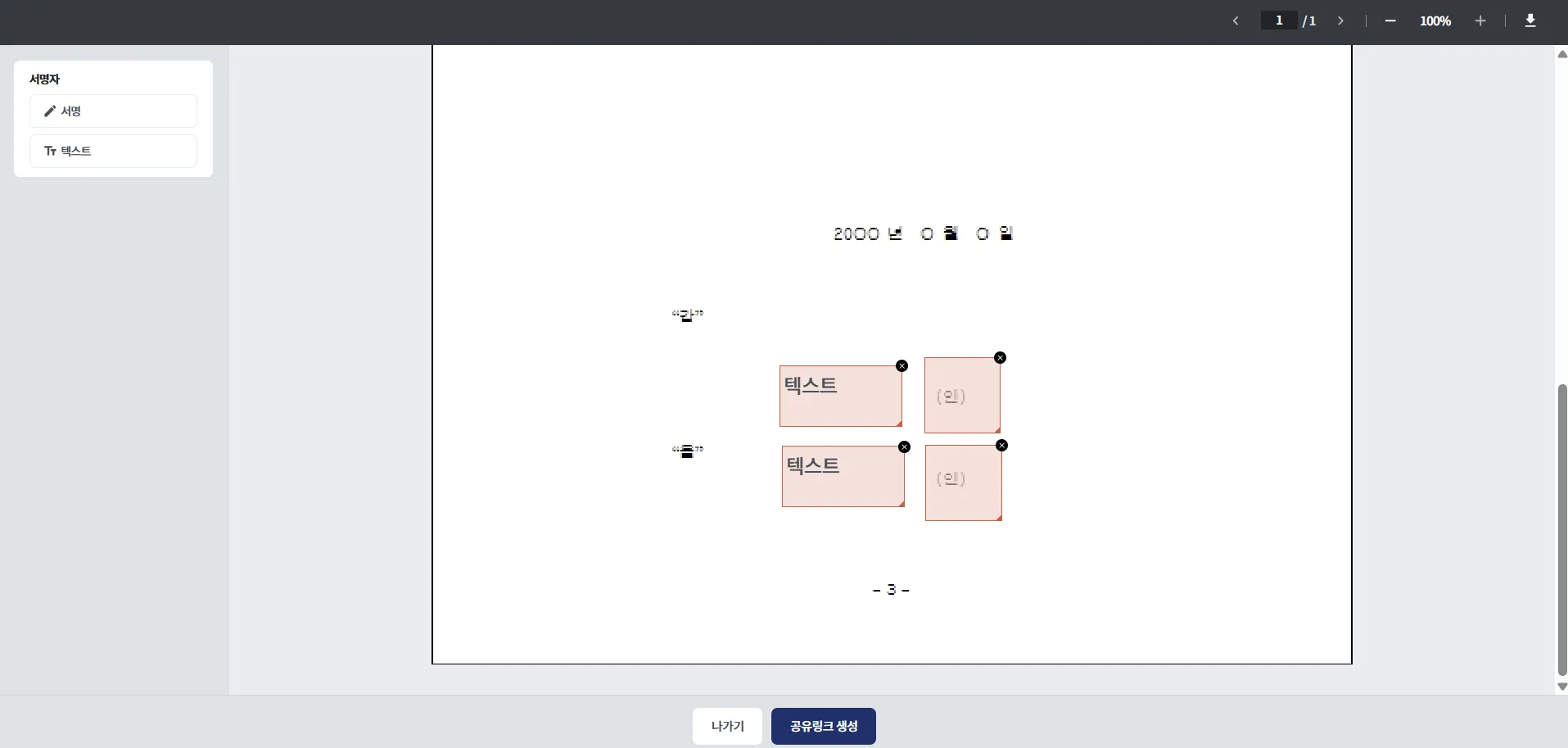 원하는 곳에 텍스트 및 서명 위치를 지정하고, 링크를 생성하면 이후 해당 파일에 접근하는 사람은 반드시 NDA의 해당 위치에 서명 및 텍스트를 적어야만 파일 열람이 가능합니다.