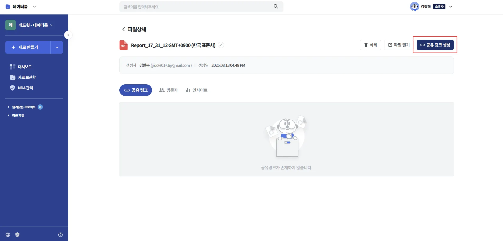 파일 상세 화면에서 공유 링크 생성을 클릭하면 공유 링크를 만들 수 있습니다.