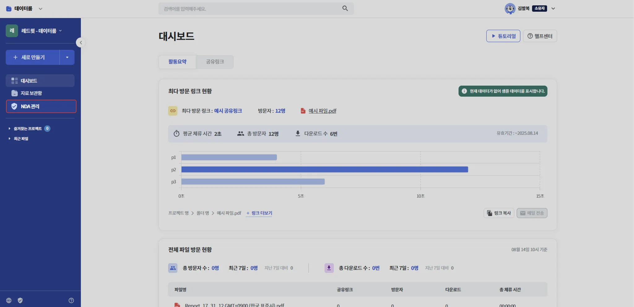 업로드된 NDA 문서는 공유 링크 생성 시에 첨부하여 사용할 수 있으며, 폴더 별로 기본 NDA를 세팅할 수 있습니다.