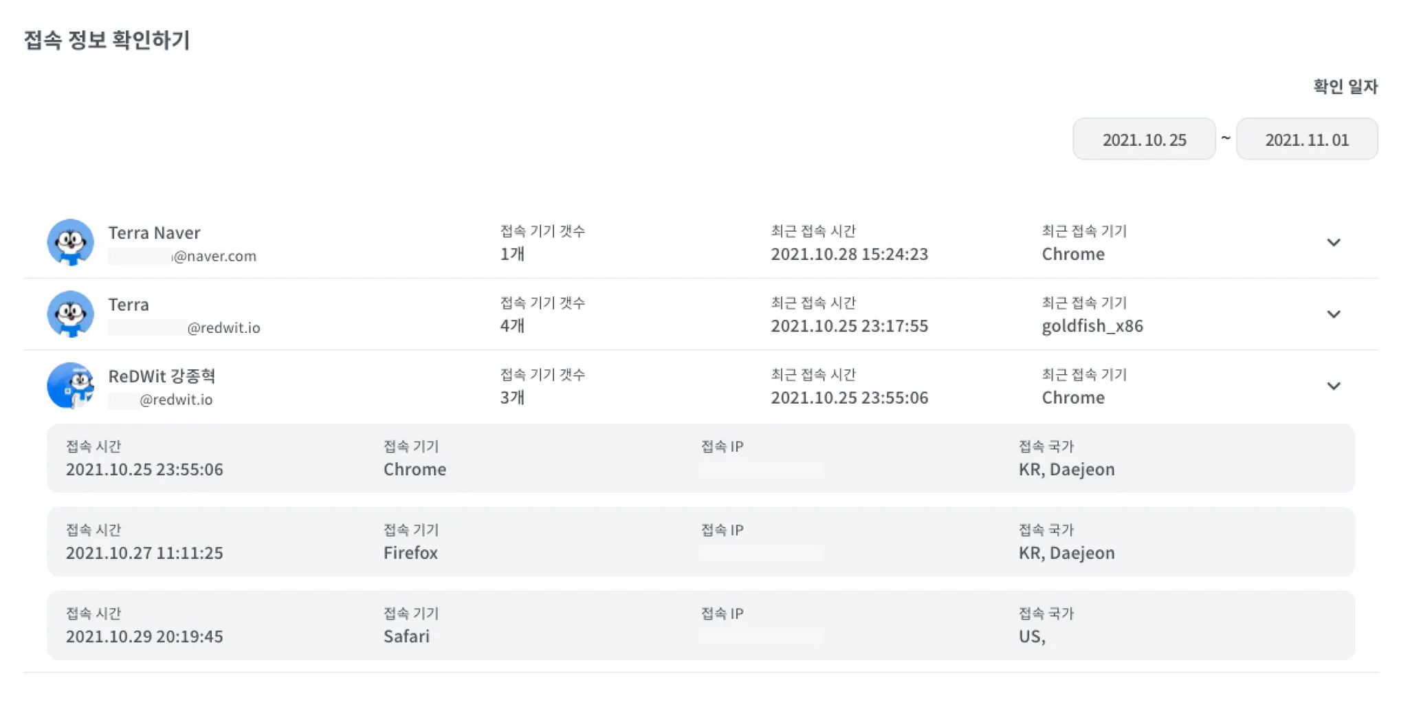 접속 정보를 통해서 이상한 접속 기록이 없는지 관리할 수 있습니다!