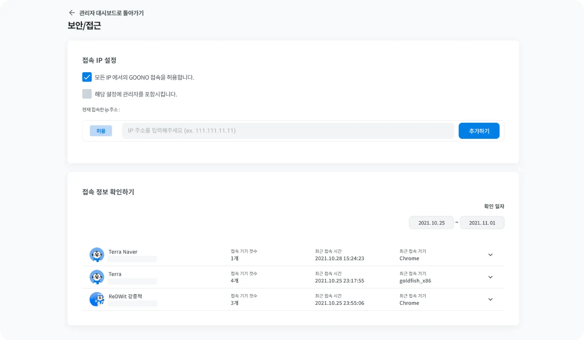 GOONO 웹 서비스 내 관리자 대시보드 페이지에 접근하면, 보안/접근 탭을 확인할 수 있습니다!