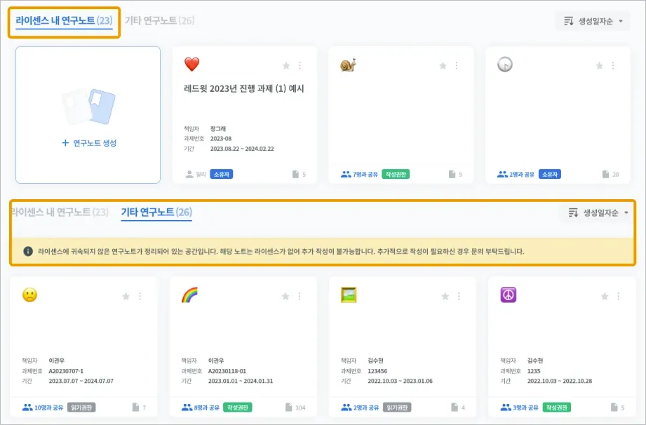 이제 유효한 라이센스에 포함되어 있는 연구노트는 [라이센스 내 연구노트] / 만료된 라이센스 또는 라이센스가 설정되지 않은 연구노트는 [기타 연구노트]로 구분됩니다.