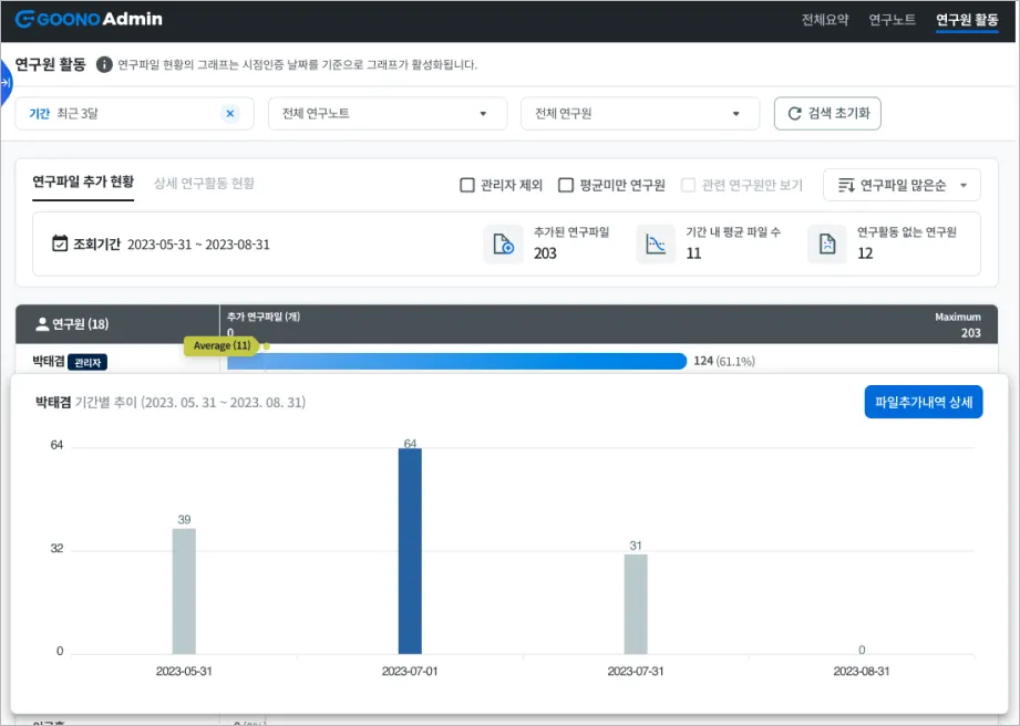 그 중에서도 개개인의 연구노트 작성 추이를 차트로 확인할 수 있게 되었습니다.
