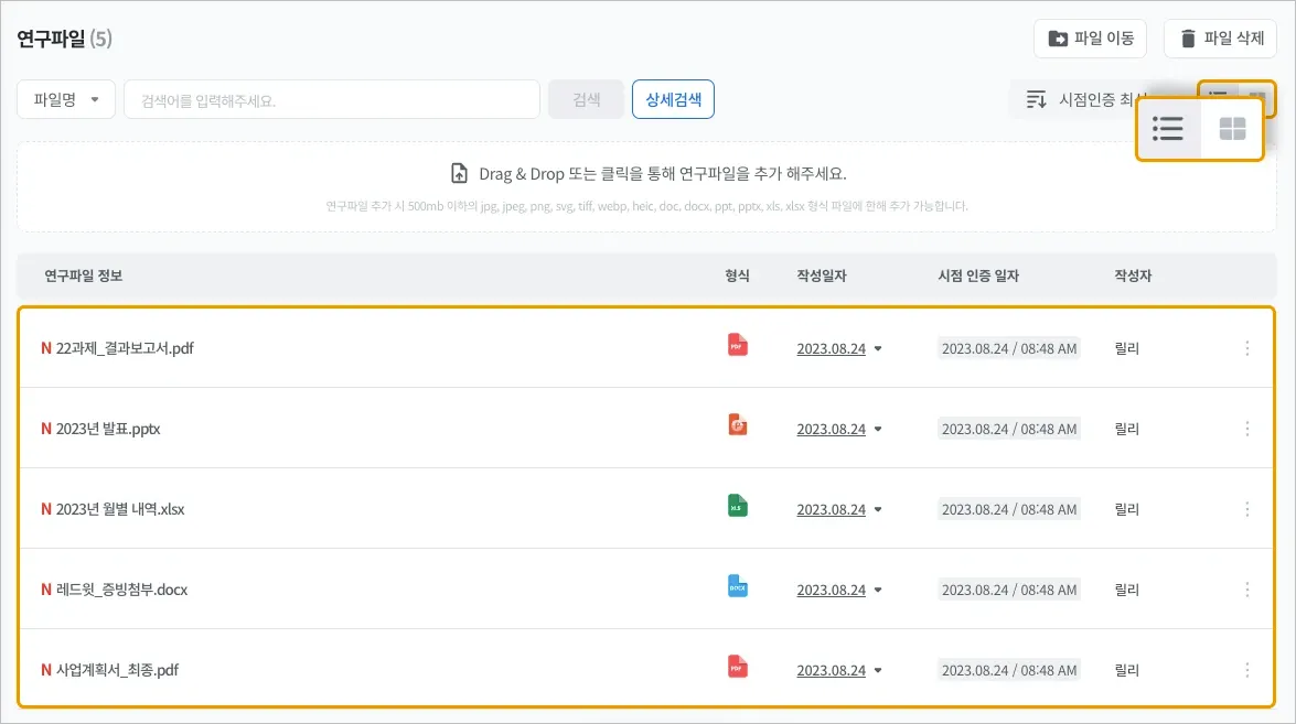 [리스트 보기] 모드에서는 파일명과 확장자, 일자, 작성자명까지 확인하실 수 있습니다.