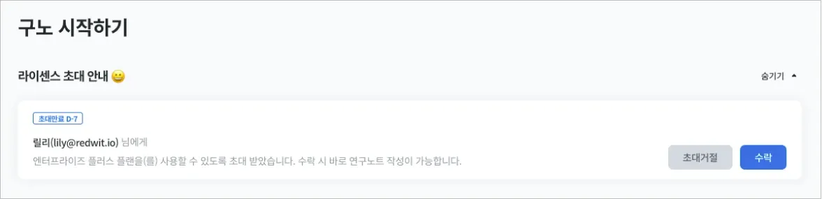 기존에 메일로만 발송되었던 라이센스 초대가 이제, 로그인 즉시 메인에 초대 알림 메시지가 뜨게 됩니다.