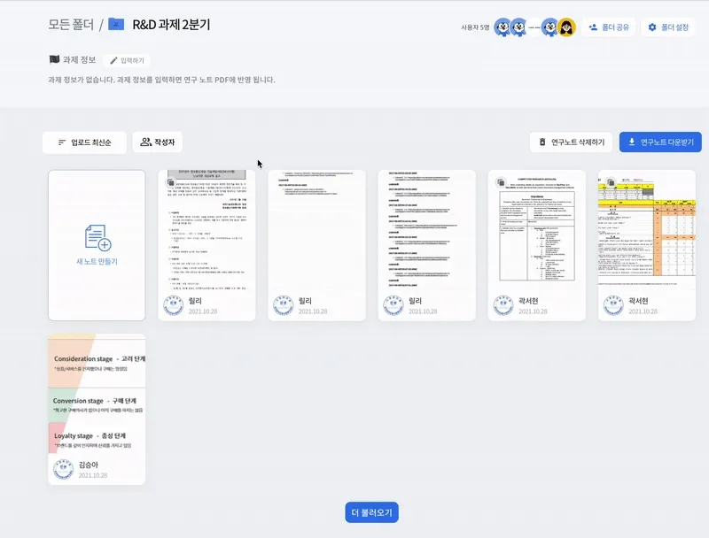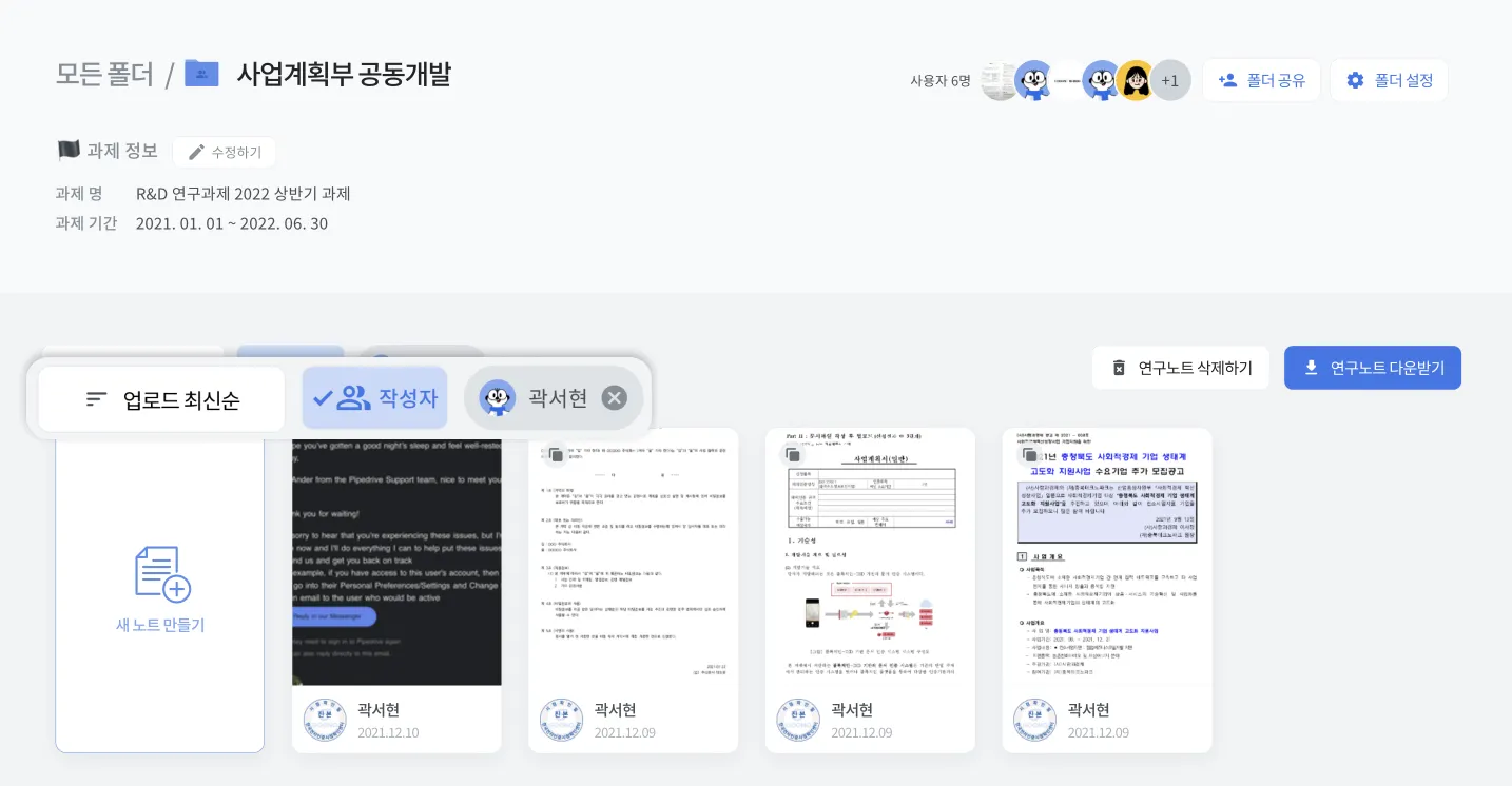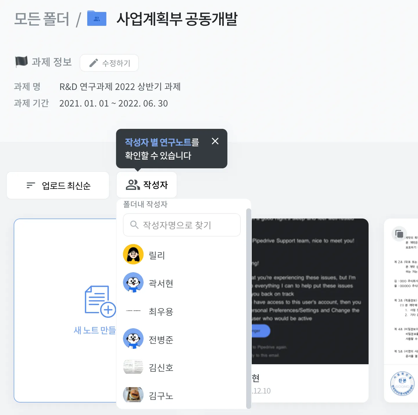 작성자 필터링 기능으로 작성자별로 업로드한 연구노트를 확인하실 수 있습니다. 작성자 선택 및 작성자 이름을 검색하여 필터 적용으로 보다 편리하게 노트 검색에 활용해보세요.