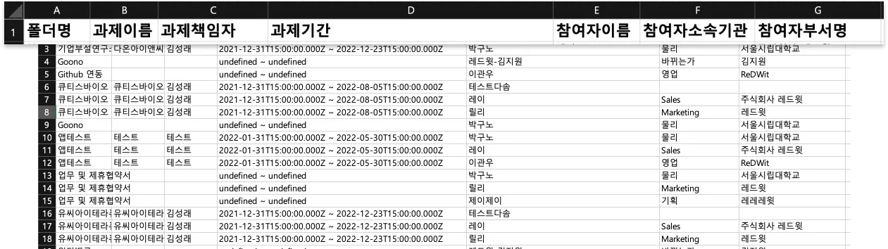 동일한 라이센스 내 연구원들이 참여한 폴더와 과제 정보를 엑셀 파일로 다운로드할 수 있습니다.