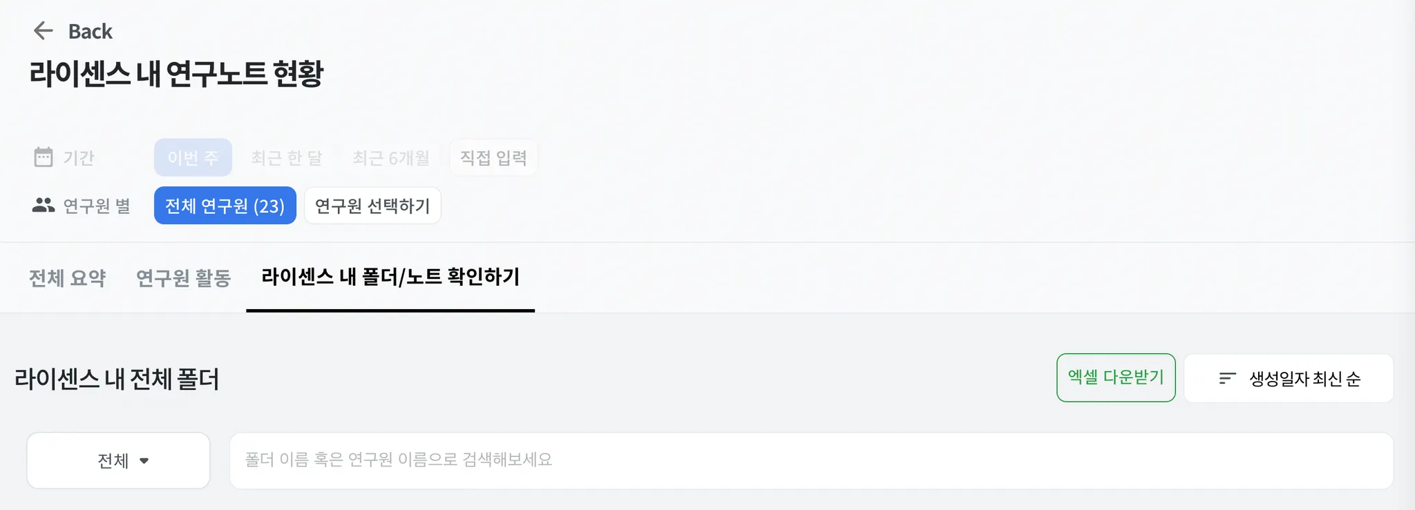 관리자 대시보드 내 연구노트 현황 페이지에서 라이센스 내 폴더/노트 확인하기를 엑셀 파일로 다운로드하여 확인하실 수 있습니다.