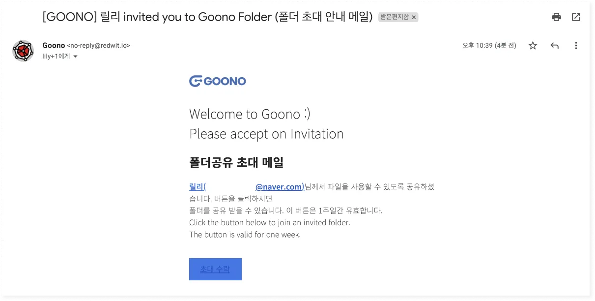 폴더를 공유 받으면 메일로 알림을 받을 수 있습니다.