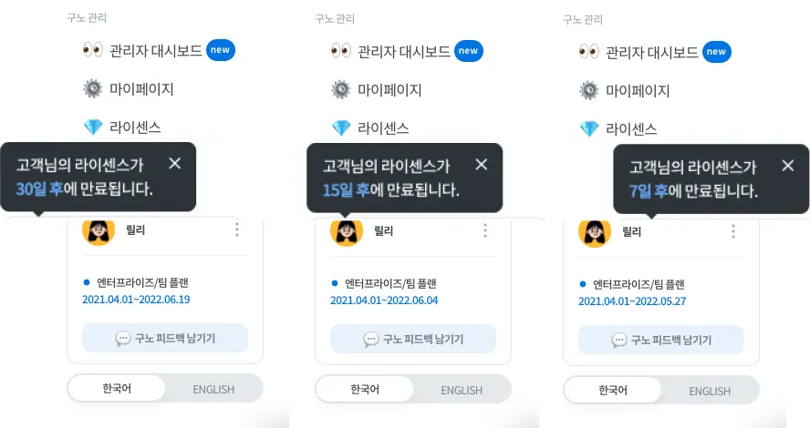 라이센스가 만료되기 30일 전, 15일 전, 7일 전에 만료 예정 툴팁 메시지를 확인하실 수 있습니다.