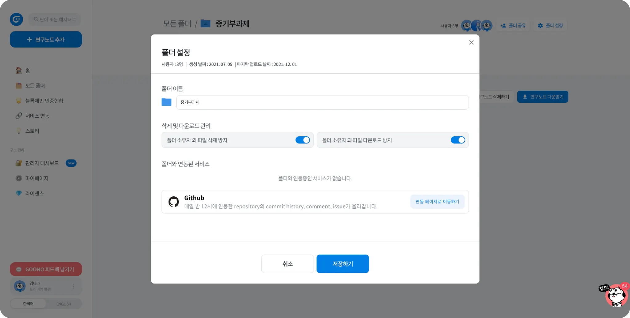 폴더 설정 버튼을 클릭하면, 기존의 폴더 내 연구노트의 삭제/다운로드 방지 관리 및 연동된 깃헙 정보가 나옵니다. 폴더의 세분화된 권한 설정과 여러 정보들을 이제 한 눈에 확인할 수 있습니다!