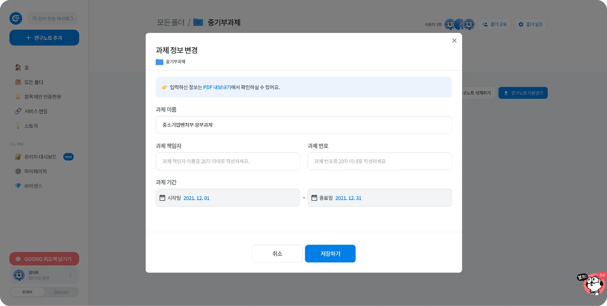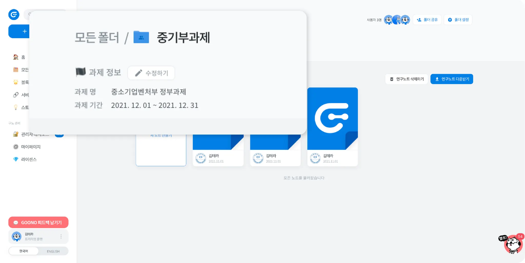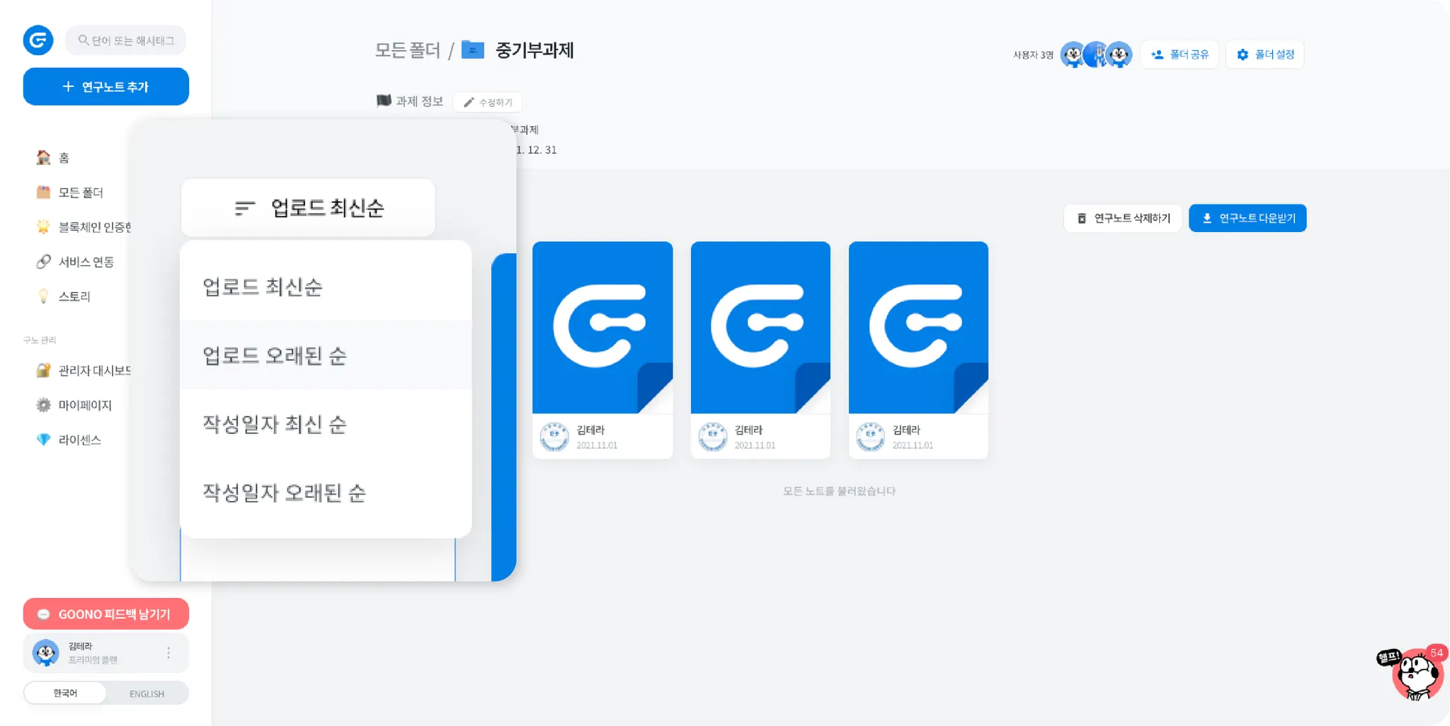 사용자 여러분의 폴더 안에서의 다양한 액션을 진행할 수 있도록, 이번에 GOONO 의 폴더 안 화면이 리뉴얼되었습니다! 이제 폴더 안에서 연구노트에 대한 다양한 활동을 진행해보세요! 새로운 폴더 안 화면 지금 만나볼까요?