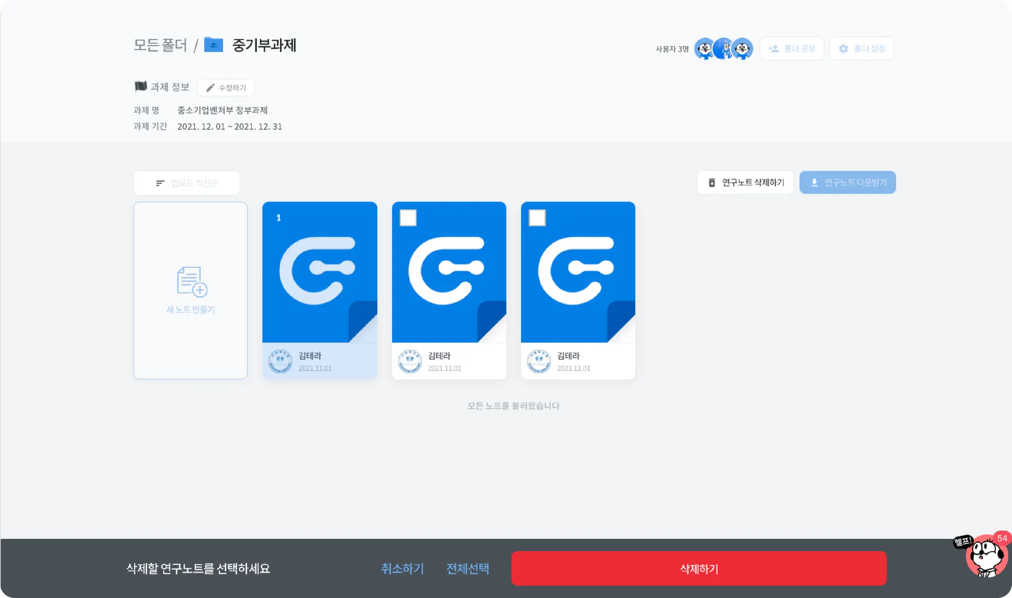 "연구노트 삭제하기" 버튼을 클릭하면, 여러 노트를 선택할 수 있는 모드로 변경됩니다. 삭제할 노트를 선택하고 삭제하기를 눌러 연구노트를 삭제 진행할 수 있습니다. (단, 폴더 내 삭제 방지가 되어 있는 경우 혹은 폴더 내 권한이 없는 경우 연구노트를 삭제할 수 없습니다.)